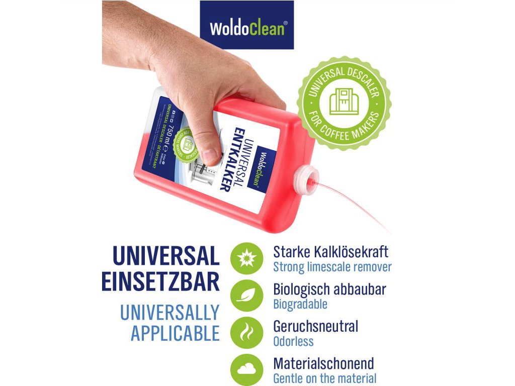 Tekutý odvápňovač WoldoClean spolehlivě rozpouští vápenaté usazeniny a vodní kámen. Je ideální pro pravidelné odvápnění kávovarů, varných konvic, espresso strojůa dalších zařízení přicházejících do styku s vodou.
