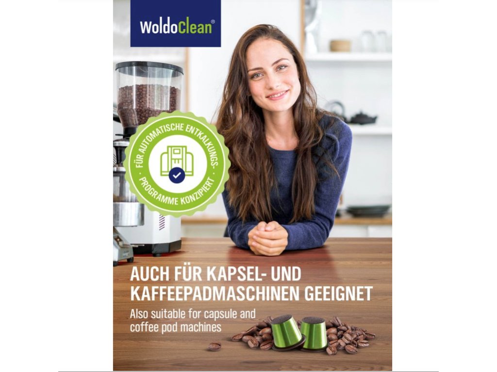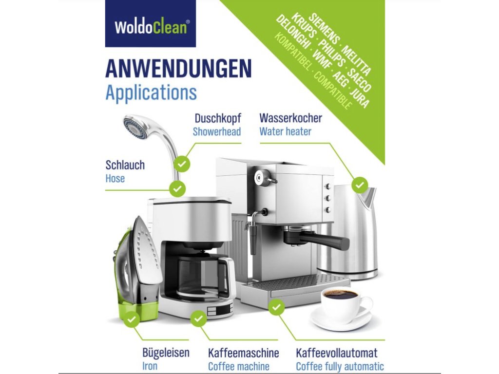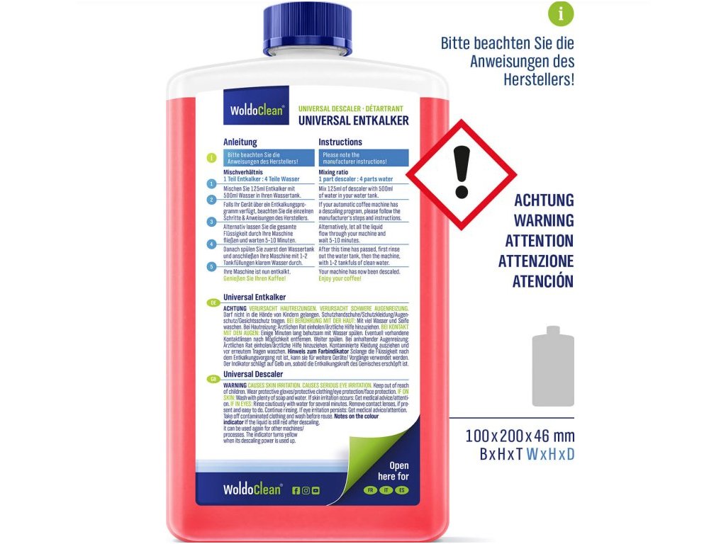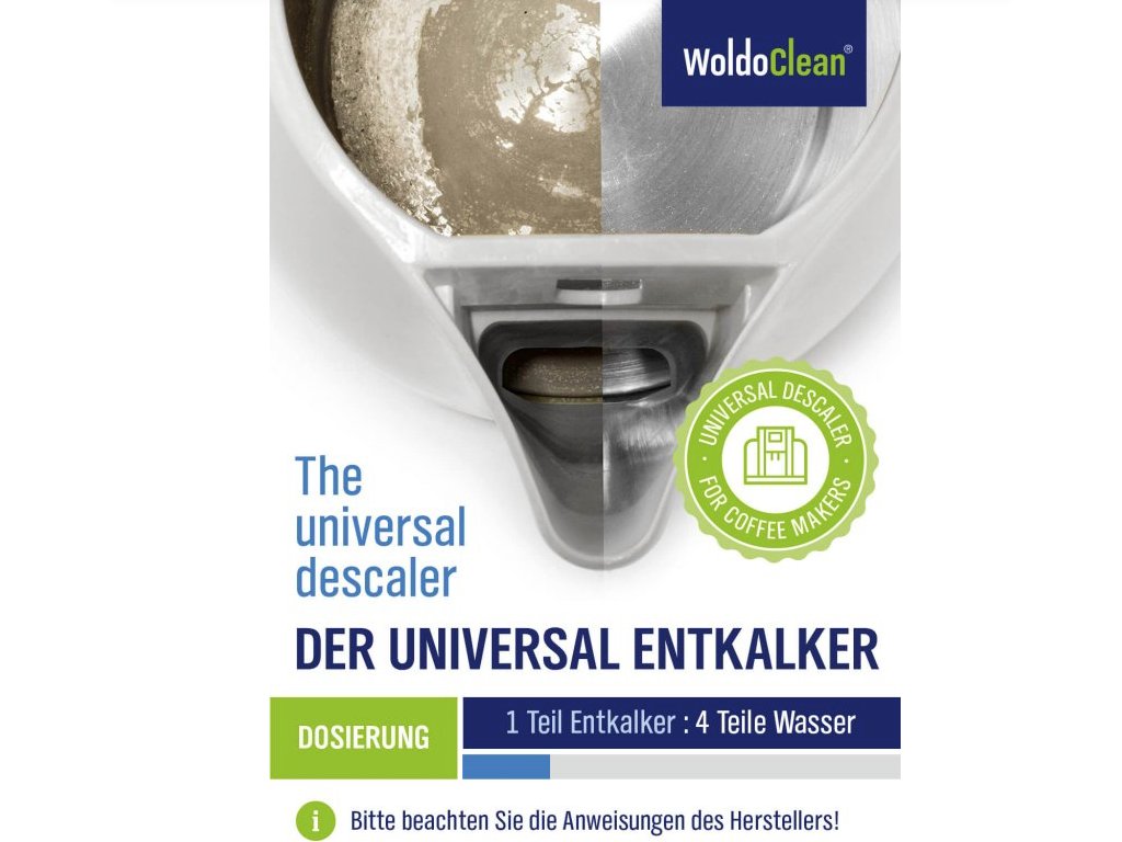 Vysoce účinný odvápňovač WoldoClean spolehlivě rozpouští vápenaté usazeniny a vodní kámen v kávovarech, varných konvicích, espresso strojích a dalších spotřebičích. Je ideální pro domácí i profesionální použití.