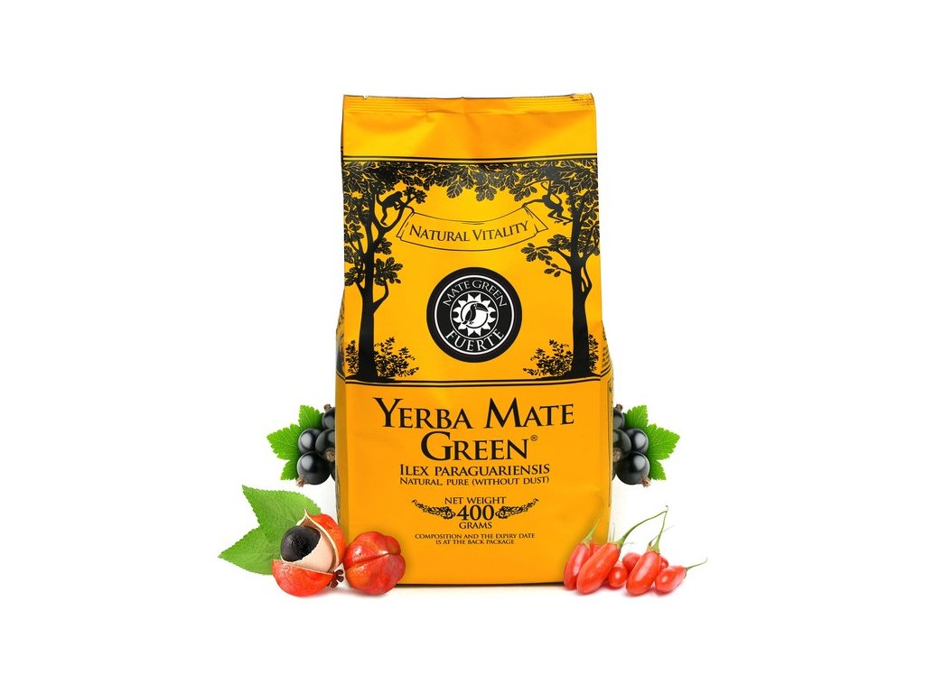 Yerba Mate Green Fuerte je směs s jedinečnou chutí obohacenou o guaranu, ve velmi vysoké kvalitě BEZ PRACHU. Obsahuje 95% lístků a 5% větviček, vše je namleto na hrubost 5 mm. Yerba Mate Green Fuerte se doporučuje pro začátečníky, kteří se bojí klasické chuti Yerba. Stejně jako všechny typy má Yerba Mate Green jemnou pachuť a díky bylinkovým a ovocným přísadám se vyznačuje krásnou vůní.