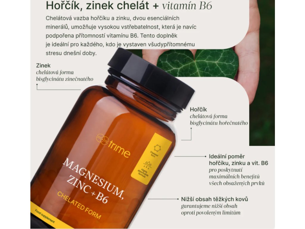 Chelátová vazba hořčíku a zinku, dvou esenciálních minerálů, umožňuje vysokou vstřebatelnost, která je navíc podpořena přítomností vitamínu B6. Tento doplněk je ideální pro každého, kdo je vystaven všudypřítomnému stresu dnešní doby.